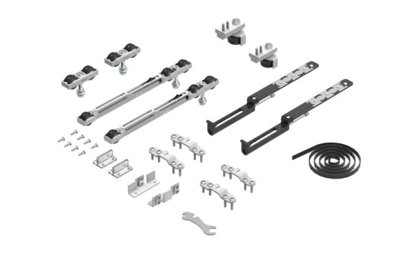 Juego para puerta de madera sincronizada 1+1 puertas con freno suave, para un máximo de 90kg por hoja y mínimo de 45kg. Movimiento progresivo con sistema de transmisión por correa.