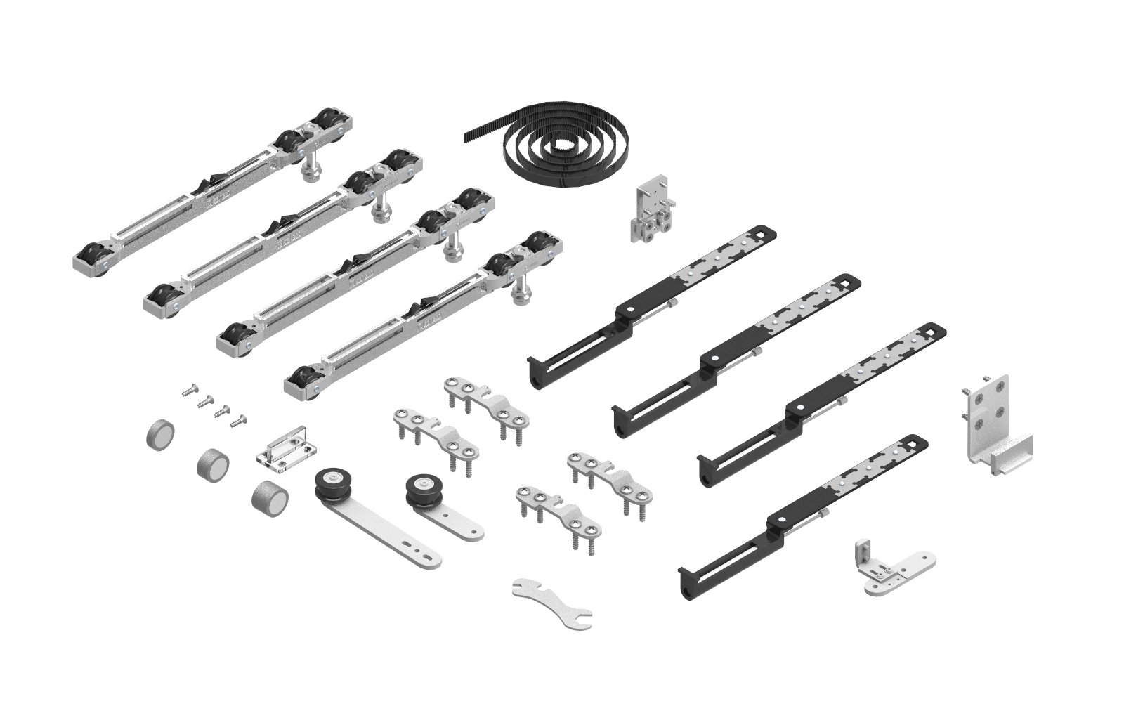 Juego para puerta de madera telescópica de 3 puertas con doble freno suave (abertura y cierre), para un máximo de 90kg por hoja y mínimo de 45kg. Movimiento progresivo con sistema de transmisión por correa.